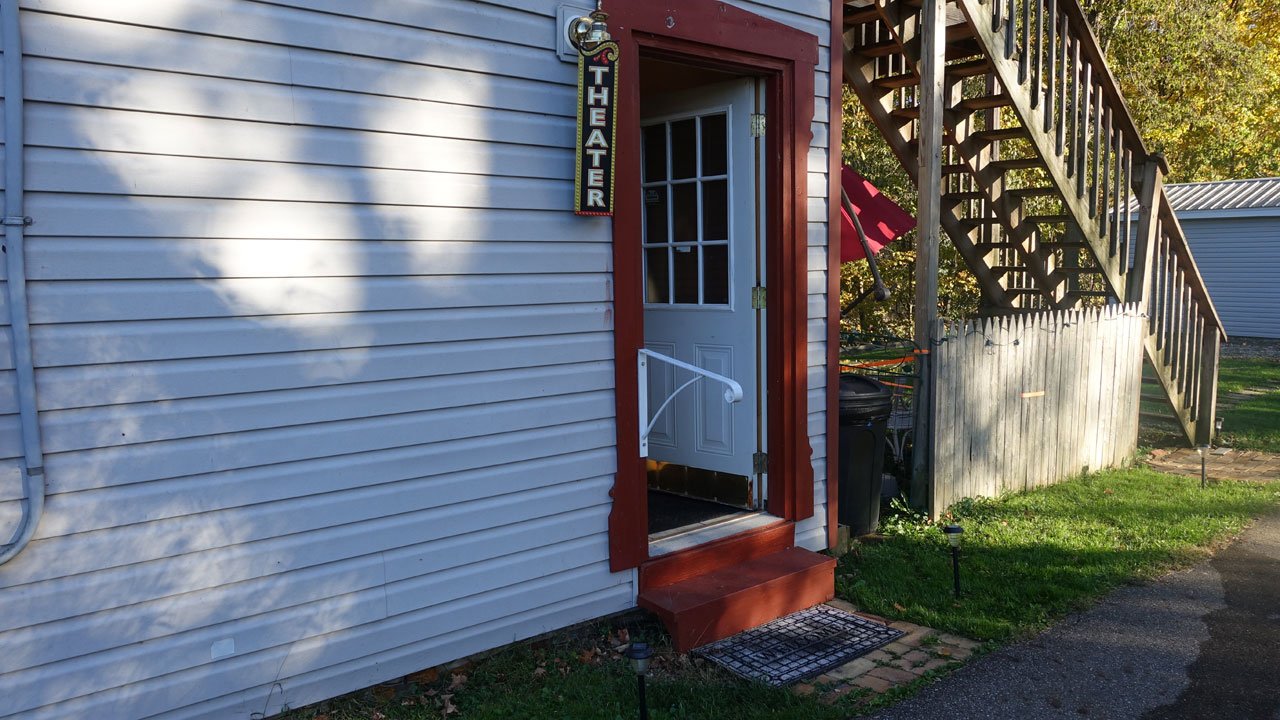- These private events are held in our “Home Theater” located on the ground floor in our two-story private residence. Please note that there are no ramps or special facility provisions for the handicapped in our home, so if these are necessary for you or any of your guests, we respectfully ask that you consider not attending. Access to the ground floor level is made from the alleyway door and requires climbing only 2 steps with a guardrail to enter. (see photo)